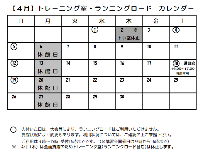 4/2(木)は全館貸切のため、トレーニング室(ランニングロード含む)は休止します。